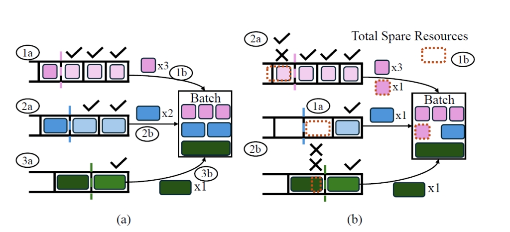The figure above illustrates the queuing process, which involves three request queues for “short”, “medium”, and “large” requests. In Figure (a), the Initial Request Admission phase is depicted. During this phase, requests are assigned to the appropriate queues based on their characteristics. In Figure (b), the system shows a scenario where spare resources are available for redistribution. This allows the system to allocate additional resources to queues that may require more capacity to process their requests.