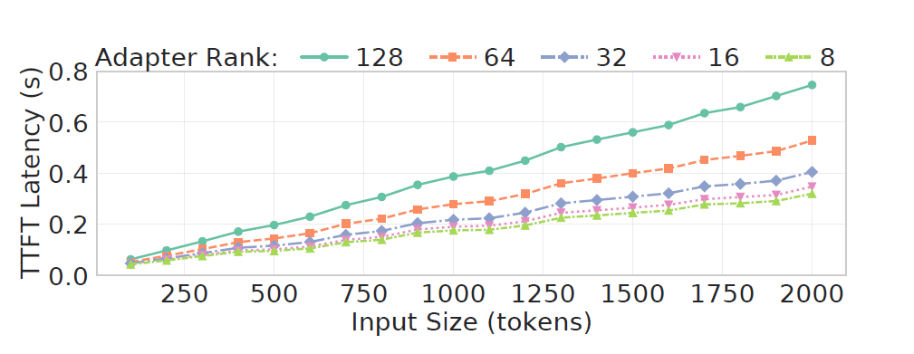 The graph above shows the increasing TTFT latency for different adapter ranks as we increase the input size of a request, i.e. the number of input tokens, while keeping the output size fixed. These results point out that adapters are an additional source of heterogeneity in LLM inference that must be managed dynamically.