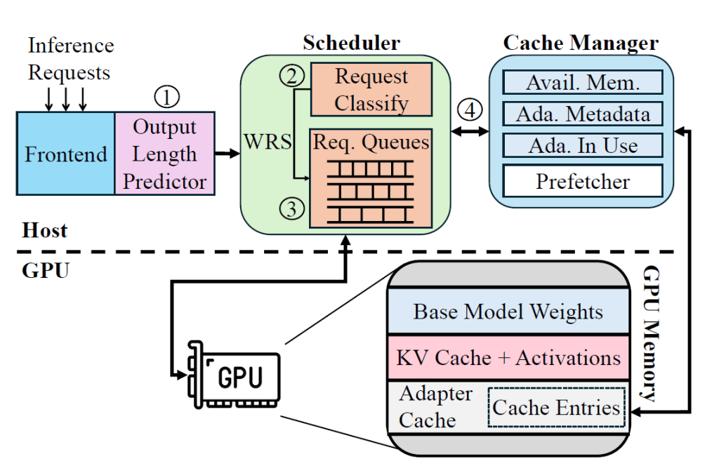 - Evicting idle adapters when GPU memory is insufficient to store incoming requests’ input, output, and key-value (KV) cache entries.