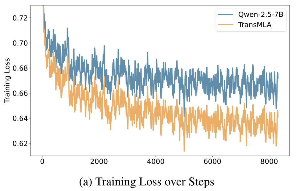 - Training Loss: The TransMLA model exhibited a significantly lower loss, indicating stronger data-fitting capabilities.