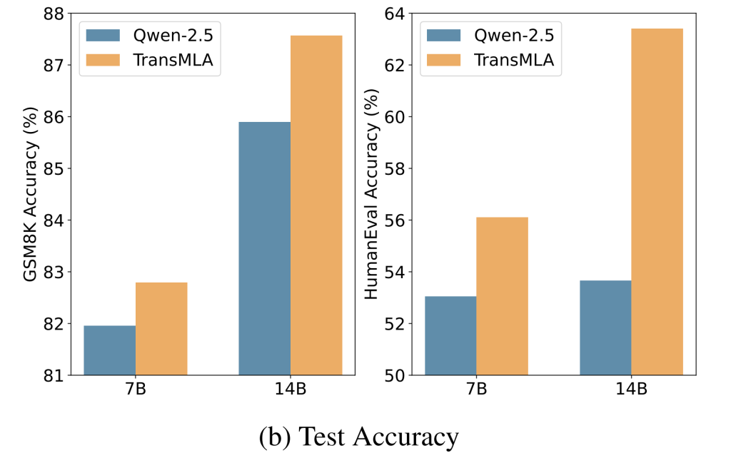 - Figure below shows that TransMLA outperformed the original GQA-based model across both 7B and 14B settings.