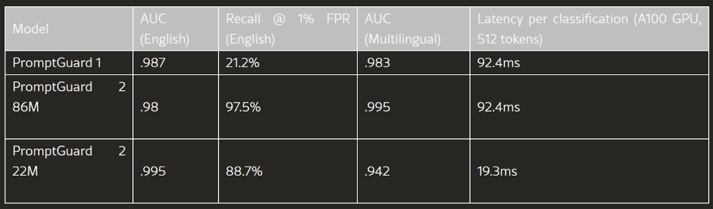 The table below shows the performance results of Meta’s PromptGuard Guardrail. The experiments are run on A100 GPU, with model input size of 512 tokens. Even though the framework delivered sub 100 ms latency, on higher input size of 4k or 8K, this latency could sum up to several seconds.