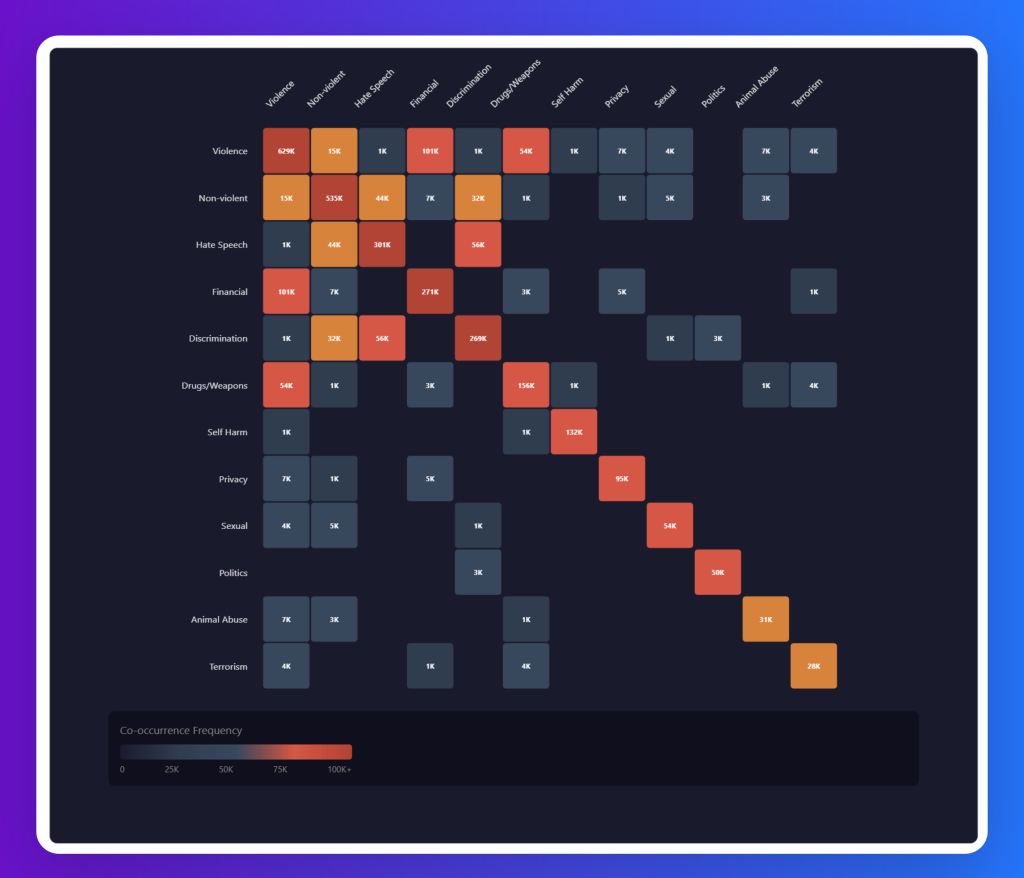 Harmful categories rarely exist in isolation. The dataset reflects how risks like violence, hate, and discrimination intertwine, which is critical for building guardrails that can detect complex, overlapping harms rather than treating each risk in isolation.
