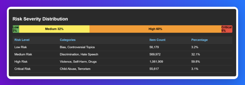 The dataset is heavily weighted toward high-risk content (60%), such as violence, self-harm, and drugs, ensuring strong guardrail coverage against the most dangerous threats. Medium-risk categories like discrimination and hate speech make up 32%, reflecting their frequency and social impact. Critical risks—child abuse and terrorism—account for 5%, representing the most severe harms, while low-risk content such as bias and controversial topics contributes just 3%, adding nuance without dominating the dataset.