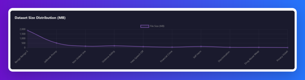 The chart below shows the dataset size distribution across harm categories, highlighting that benign content makes up the largest share (nearly 2GB), followed by jailbreak prompts, while other categories like violence, hate speech, self-harm, and privacy violations are smaller but still represented—illustrating both the scale and diversity of the dataset.