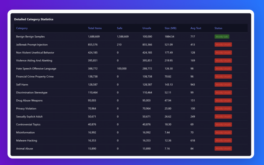 The chart below reveals how the dataset is structured around different types of harmful content. The largest share comes from violence-related content, followed by non-violent unethical behavior and hate speech, showing clear emphasis on the most pressing risks. Mid-sized portions include financial crime and discrimination, while smaller but essential categories like drugs/weapons, self-harm, and privacy violations ensure broader coverage. Together, this distribution shows that the dataset isn’t just massive in scale—it’s carefully balanced to capture both the most frequent harms and the most critical edge cases.