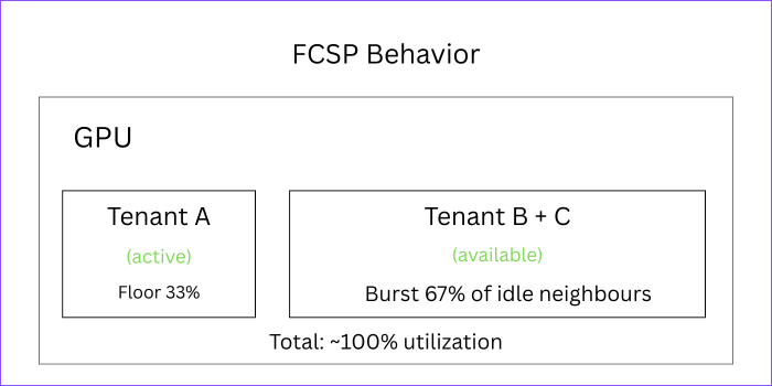 With MIG’s static allocation, idle instances can’t share resources. For example consider a scenario where 3 MIG instances are present but only one tenant is active. Here, Tenant A limited to 33% even though 67% of hardware resources are idle.
