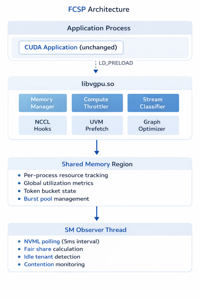 Resource usage is tracked in a shared memory region, maintaining per-process metrics, global utilization data, token bucket states, and burst pool management, enabling real-time visibility into GPU activity. The SM Observer Thread continuously monitors GPU status via NVML, calculates fair-share allocations, detects idle tenants, and tracks contention, ensuring resources are dynamically rebalanced. Together, these components allow FCSP to deliver high efficiency, flexibility, and multi-tenancy on any CUDA-enabled GPU.